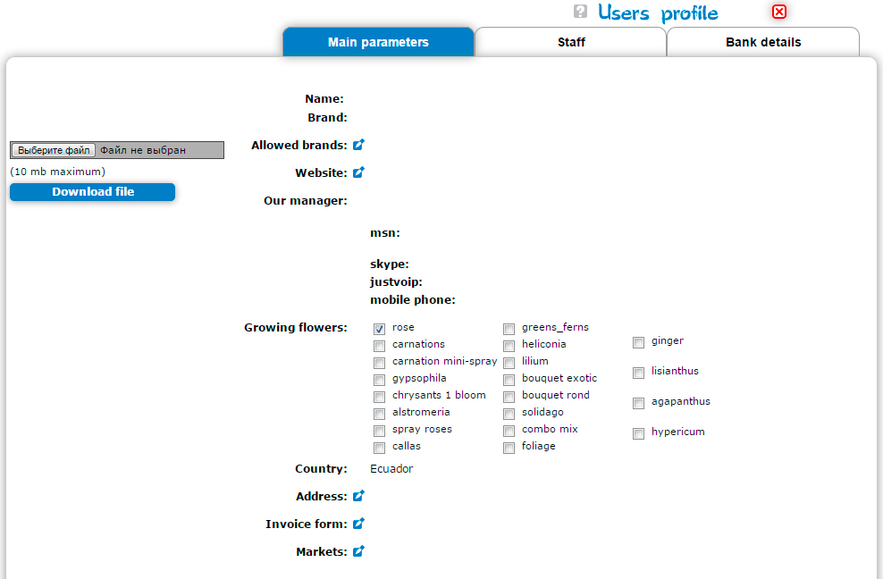 • basic data (farm name, brand name, flower types produced). The system also permits to upload a JPG- image of the farm logo (if the existing one gets old)