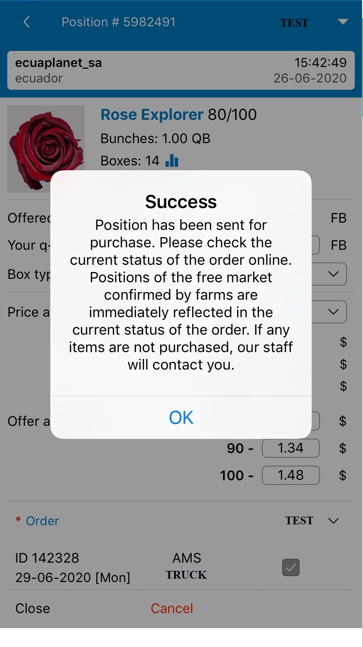 If request is sent successfully, the User receives notification that position has been sent for purchase.