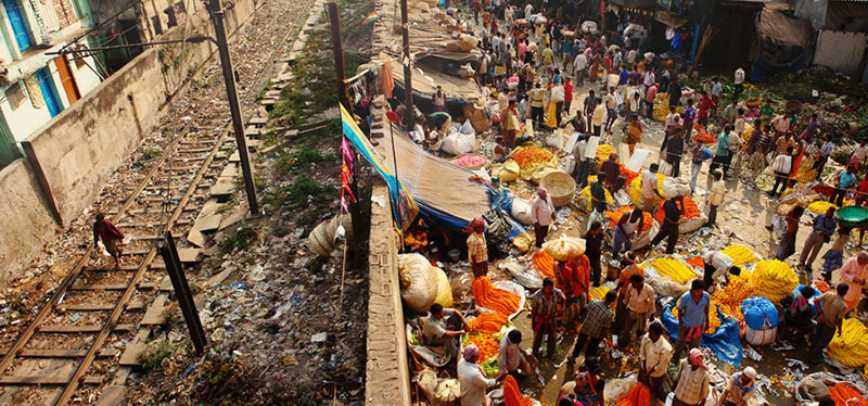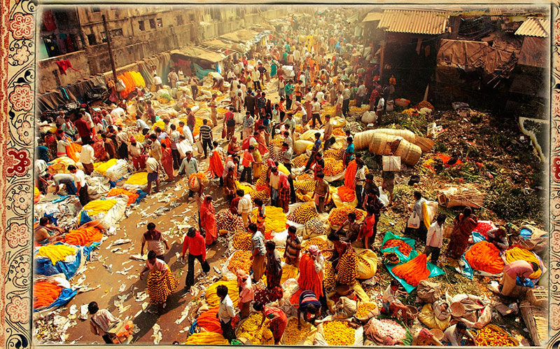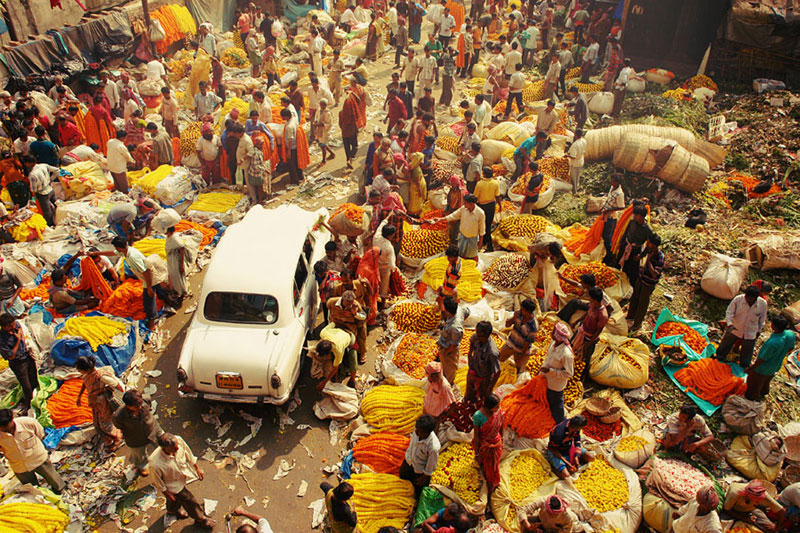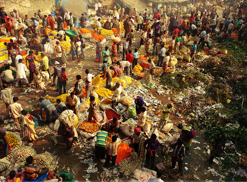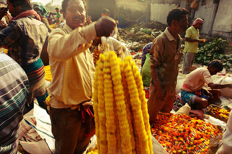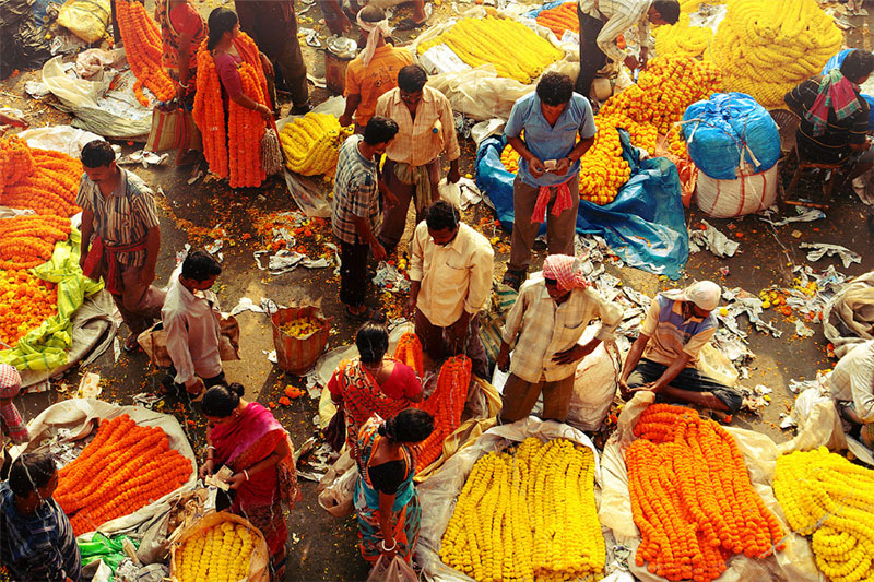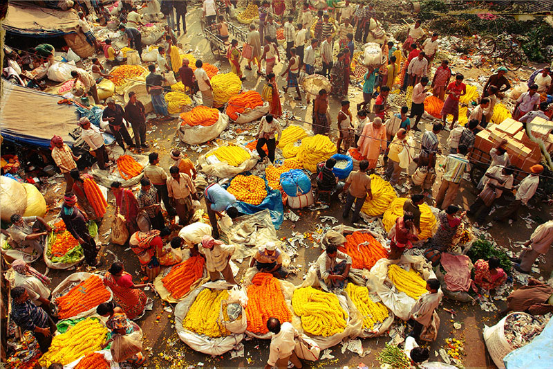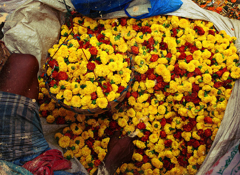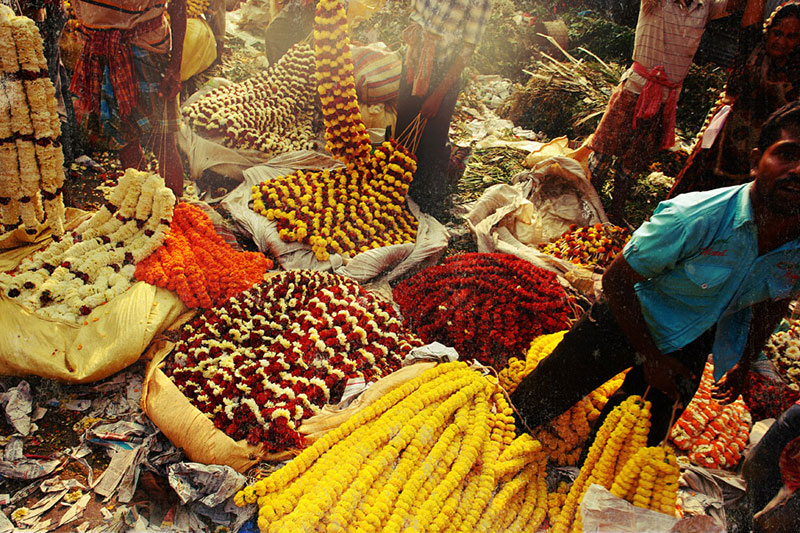 Flower market in Calcutta(India) amazes with its riot, bright colors and quantity of flower goods. Flowers in the market are located everywhere - both on the ground, and on the benches, and suspended on threads, they seem to occupy the entire space of the market. Local residents actively use flowers as a gift in temples and to decorate their homes.