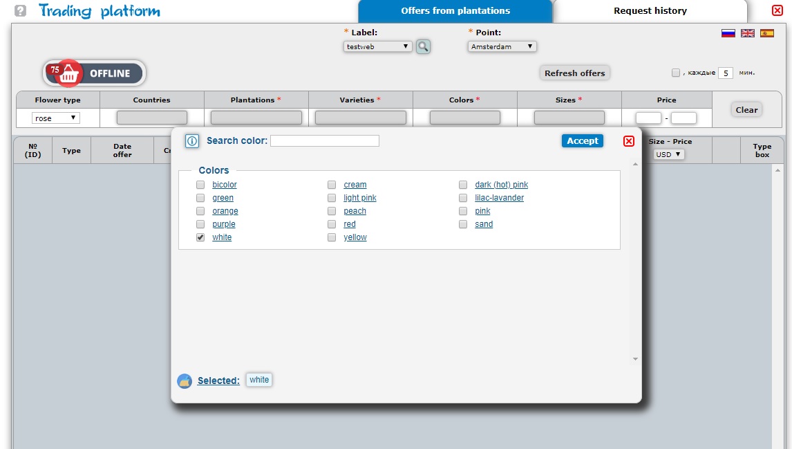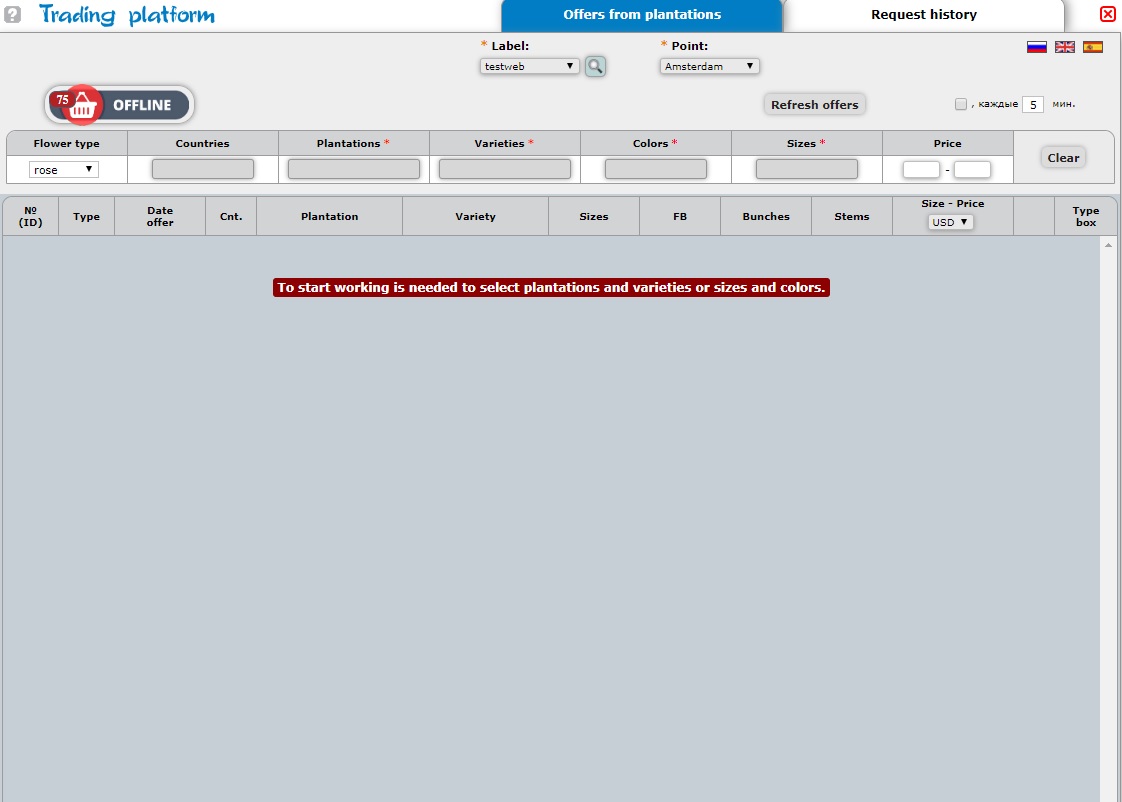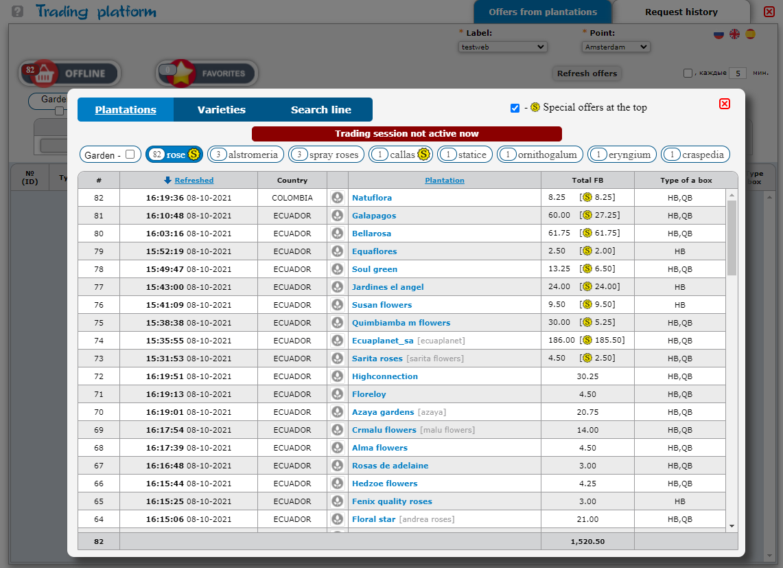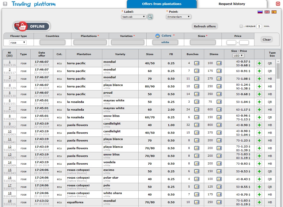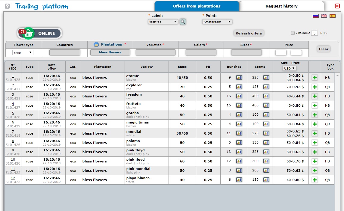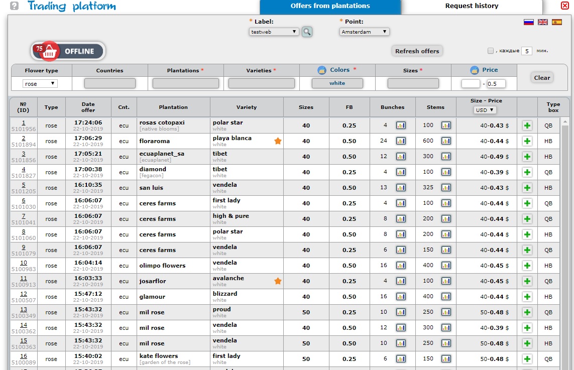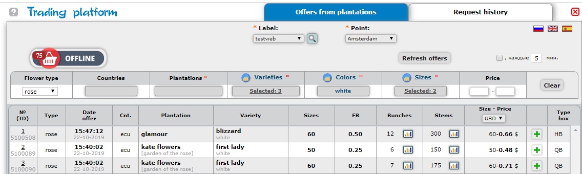 Click the left mouse button on “Online Offers” to display the list of plantations that offer their flowers on the free market today. ->